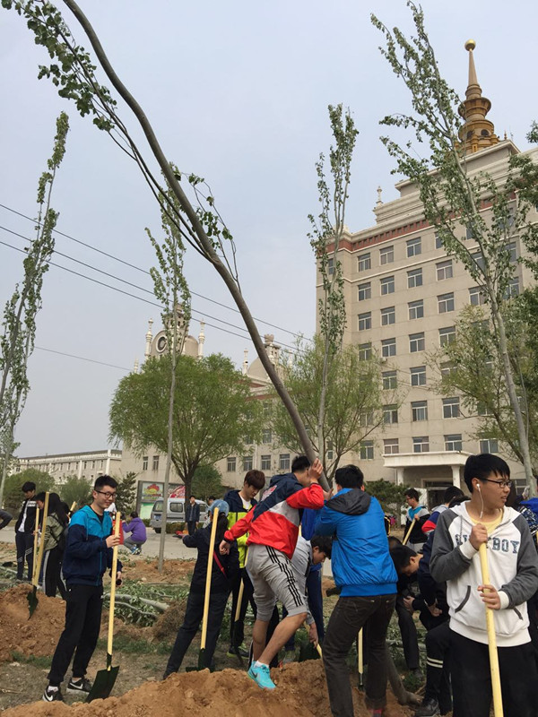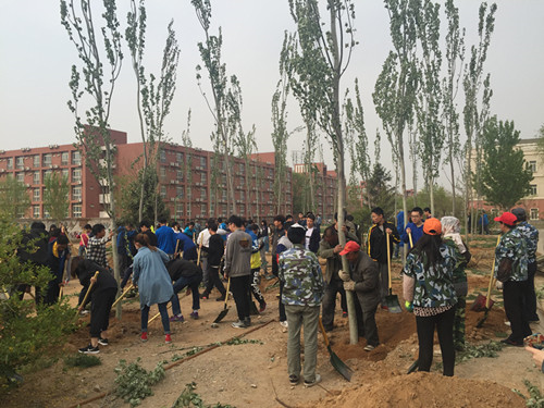 與往年由后勤處綠化、保潔、工程師傅承擔植樹任務不同,今天的植樹現場出現了老師和同學們的身影——計科系主動承包了明德樓南空地楊樹苗的種植任務。早上8:00,同學們在場地集合,在綠化師傅的指導、幫助下抬樹、扶樹、培土、壓實,大家干勁十足,現場熱火朝天,2個小時內140棵楊樹紛紛有了“歸宿”。植樹之余,計科系不少同學還在現場豪氣認領樹木為“兒子”、“女兒”,并表示將負責樹木的生長看護,計科系團總支當即表示愿意“承包”這片楊樹林,為學院綠化貢獻自己的力量。