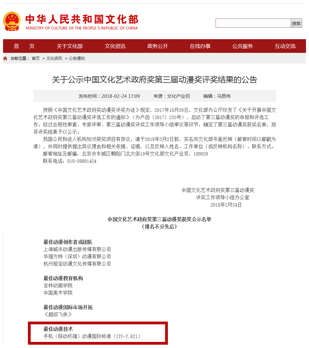 近日,學(xué)院科研與產(chǎn)業(yè)處處長(zhǎng)陳洪所帶領(lǐng)團(tuán)隊(duì)申報(bào)的“ITU-T.621手機(jī)(移動(dòng)終端)動(dòng)漫國(guó)際標(biāo)準(zhǔn)”榮獲中國(guó)文化藝術(shù)政府獎(jiǎng)第三屆動(dòng)漫獎(jiǎng)“最佳動(dòng)漫技術(shù)獎(jiǎng)”。