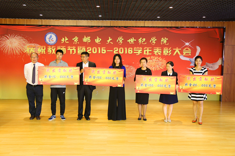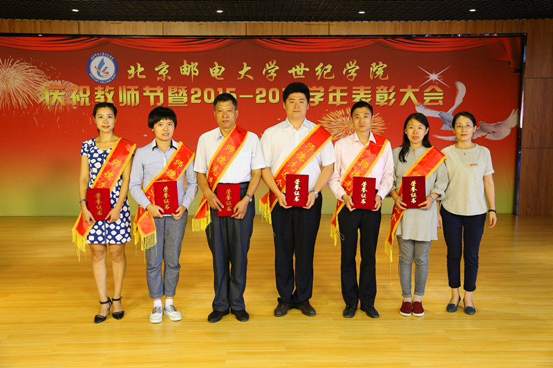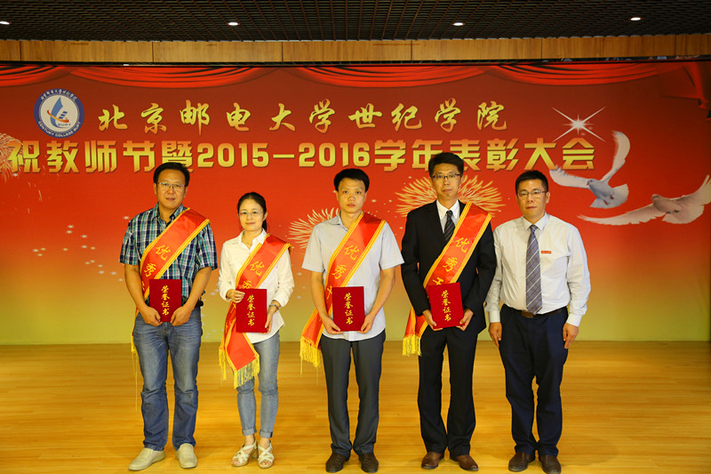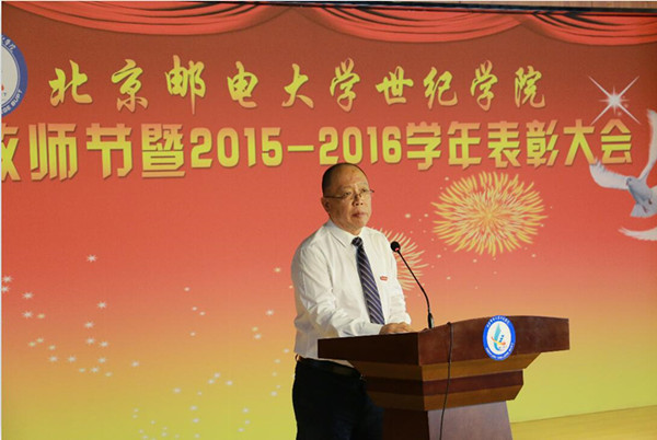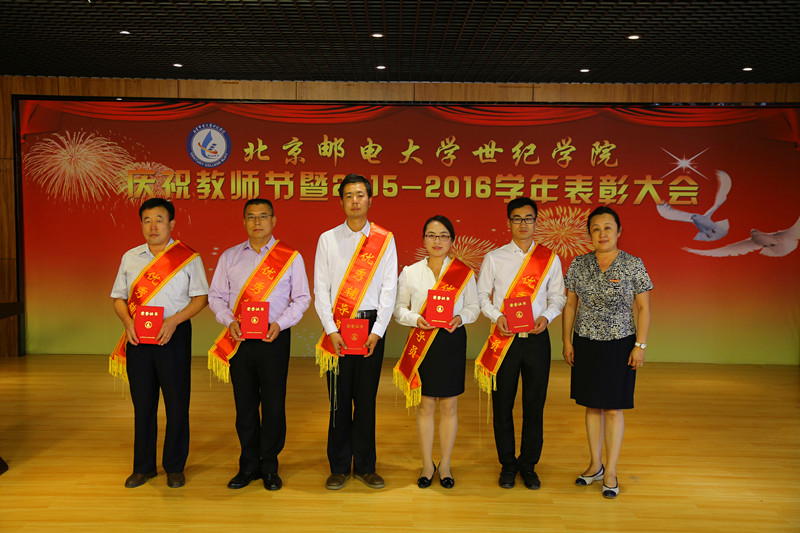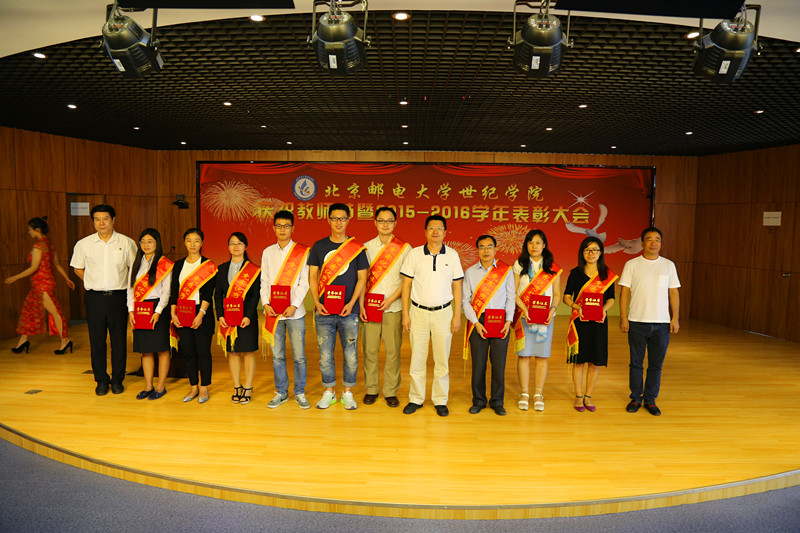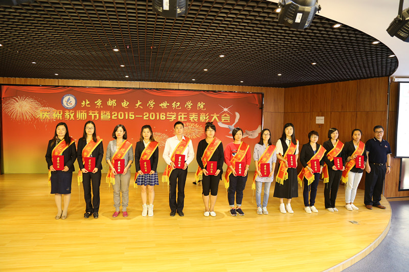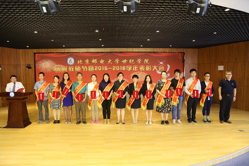9月9日,在第32個教師節到來之際,我院隆重舉行慶祝教師節暨2015-2016學年表彰大會。北京郵電大學副校長、院長李杰,學院黨委書記謝苗峰,副院長李新松、孫凱、夏素霞、何曉玫及全體教職員工齊聚學思樓127教室,共慶教師們自己的節日。同時,大會特別邀請了為支持學院發展建設、為學院捐資助學的東方雨虹集團人力資源總監丁毅,浙商銀行機構客戶部總經理石文彬,中金天銀資本管理公司董事長梁瑞峰等幾位嘉賓。