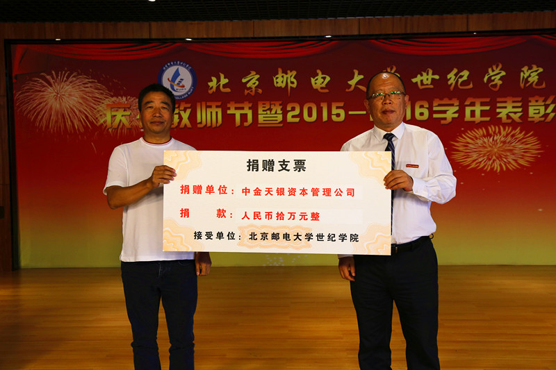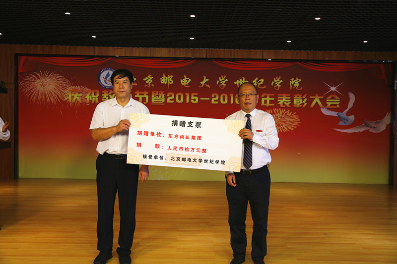 伴隨著熱烈的掌聲,東方雨虹集團人力資源總監丁毅、中金天銀資本管理公司董事長梁瑞峰分別將10萬元的支票交到李杰院長的手中。東方雨虹集團現已成為亞洲最大防水系統供應商,而中金天銀資本管理公司也屬于國內大型投資公司。大型企業的捐資將為學院今后的發展提供助力。丁毅先生在講話中,向全院教師送上了教師節的深深祝福,并表達了對學院未來的期盼,希望學院在各方支持與自身的發展下,培養出更多社會需要的棟梁之才。