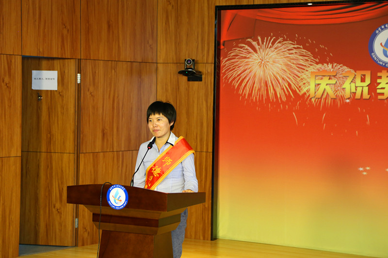 在學生代表答謝師恩后,伴隨著歡快的音樂聲,慶祝教師節表彰環節正式開始。謝苗峰書記宣讀了教師節表彰決定,與會領導、嘉賓分別為2015-2016學年度突出貢獻獎團隊、優秀干部、優秀教職工、師德先進個人、優秀輔導員及優秀學科競賽指導教師的獲獎者頒獎并合影留念。師德先進個人代表經濟管理系王媛老師、優秀干部代表財務處晏燕老師、優秀輔導員代表通信與信息工程系馮舒老師隨后發言,表達了教師們將以此鼓舞為動力,更加努力工作的決心和信心。
