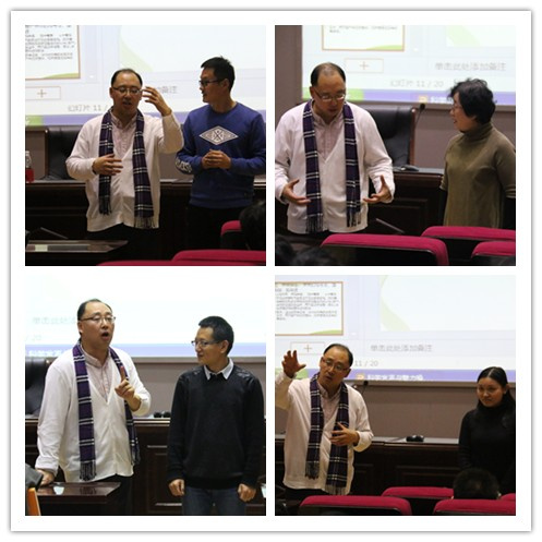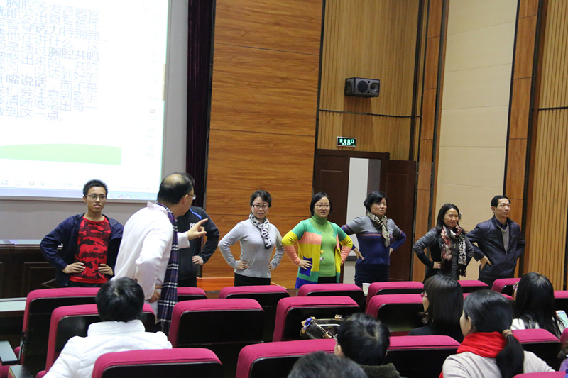 講座上,朱孟文老師從氣息控制、共鳴控制、喉部控制、聲音彈性、咬字器官等幾個(gè)模塊出發(fā),告別傳統(tǒng)的講座模式,理論與實(shí)踐相結(jié)合,請(qǐng)老師們從座位走到講臺(tái)前參與科學(xué)發(fā)聲的實(shí)訓(xùn),并進(jìn)行了針對(duì)性指導(dǎo)。