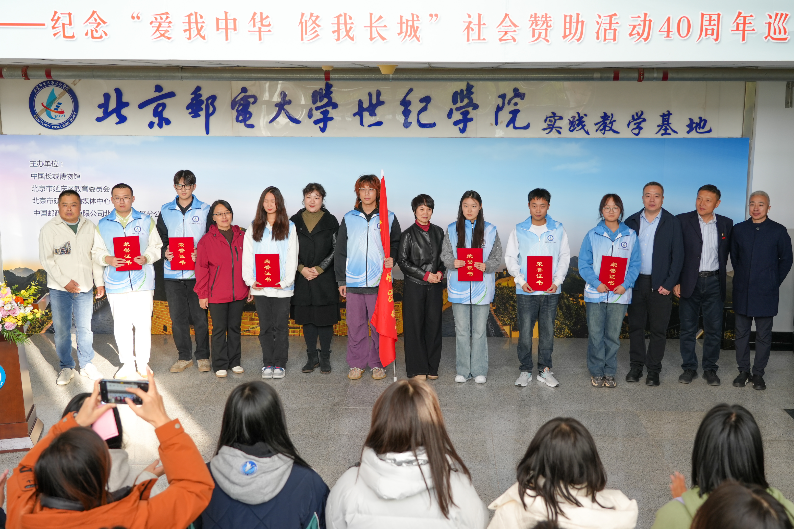中國長城博物館向學院“世紀青苗”志愿者團隊授旗,為志愿者代表頒發“中國長城博物館‘世紀青苗’長城講解員”證書。學院學生代表朗誦了由當代著名詩人阿紫創作的詩歌《長城》,并展示了專門為本次展覽創作的長城主題書法作品。