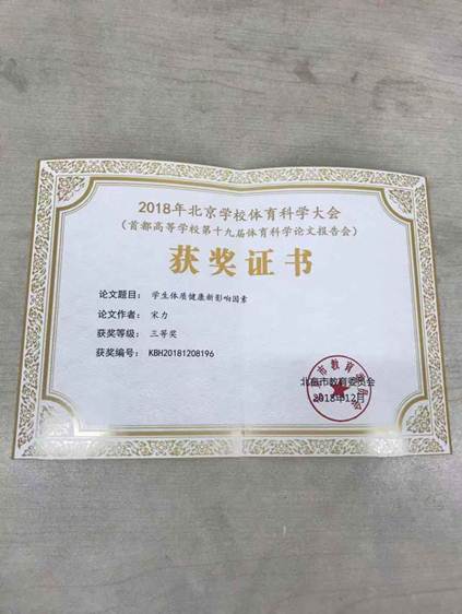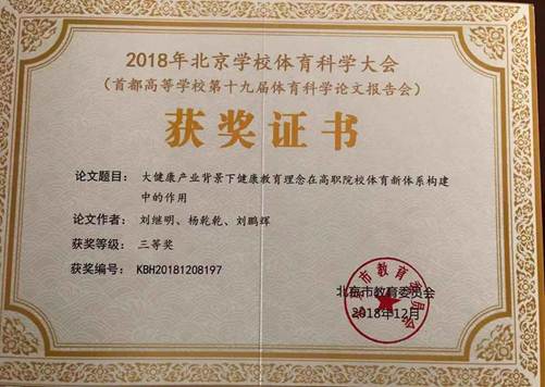 12月8-9日,在2018年北京學校體育科學大會暨首都高等院校第十九屆體育科學論文報告會中,基礎教學部體育教研室宋力、劉繼明2位老師提交的論文分別榮獲三等獎。基礎部副主任劉朋輝以及宋力、劉繼明2老師參加了會議。