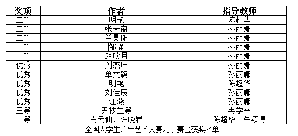 近日,在2018年第十屆全國大學生廣告藝術大賽北京賽區的比賽中,藝術與傳媒學院數字媒體藝術專業的學生取得4項二等獎、3項三等獎和5項優秀獎。同時,在2018年中國印?小福拍全國高校創新設計大賽中,數字媒體藝術專業的學生獲得1項銅獎、1項優秀獎和4項入圍獎的好成績。(藝術與傳媒學院 孫麗娜供稿)