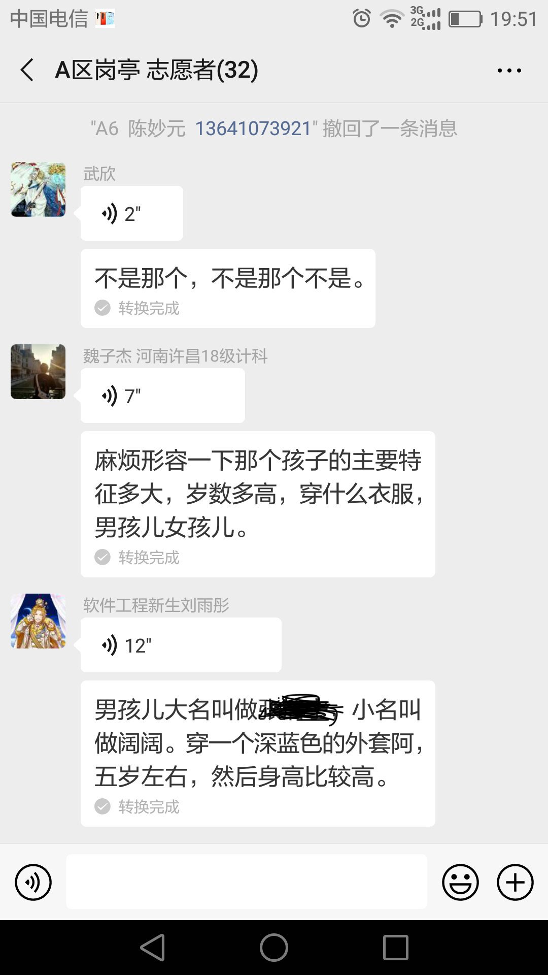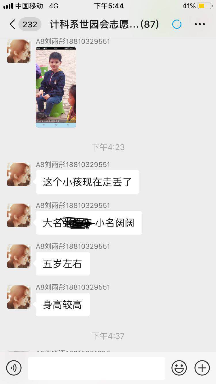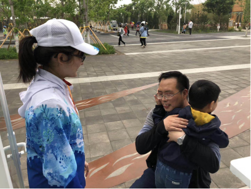 5月18日,世園會迎來了十萬游客。下午14時左右,一名游客來到A5志愿者崗亭,稱自己5歲的兒子闊闊在中國館附近走失,希望志愿者能夠幫忙尋找。之后,志愿者聯系游客服務中心,通過廣播播報尋人啟示。同時,通過對講機、志愿者微信群發布尋人信息。帶隊老師得知情況后,在不影響崗亭志愿服務的情況下,抽調部分志愿者園內進行尋找。各個崗亭在志愿服務過程中,詢問游客是否見到照片中的孩子,如見到第一時間和志愿者聯系。16:30分左右,在C7志愿者崗亭盧熠和趙雪彤等志愿者在服務過程中得知走失兒童在生活體驗館附近,在游客和志愿者的幫助下將走失兒童安全接至C7志愿者崗亭,并第一時間通知父母前來認領。至此,走失近三個小時的小闊闊終于和爸爸媽媽團聚了。