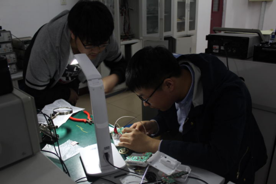 有些同學焊接電路的熟練程度讓大家贊不絕口,還有些同學對電路的組裝也特別得熟練。趙文深、王丹志老師對同學們的焊接電路進行了指導。同學們都小心翼翼的,做得非常認真和仔細,大家互相學習,互相交流。
