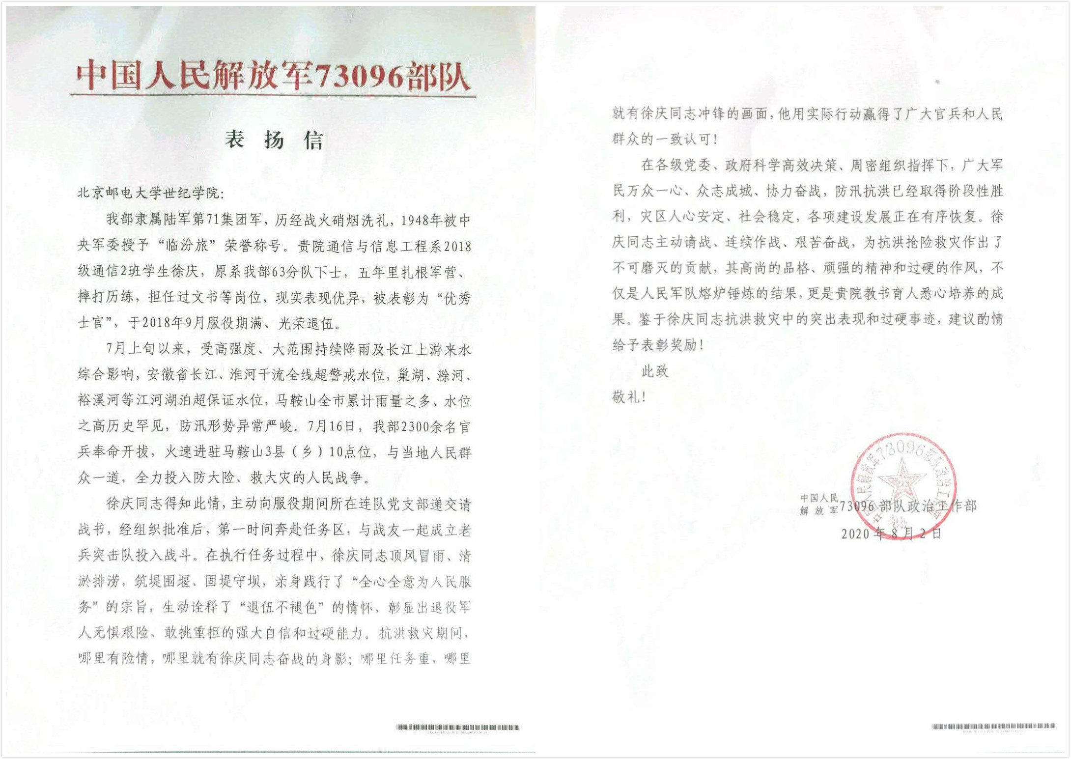 近日,學院收到中國人民解放軍73096部隊的表揚信,信中稱贊通信與信息工程系18級學生、退伍軍人徐慶同志主動前往安徽省馬鞍山災區參與抗洪搶險救災,“吃苦在前,不圖享受,退役不褪色,展示了新時代中國軍人良好的政治素質和吃苦耐勞精神?!?/span>