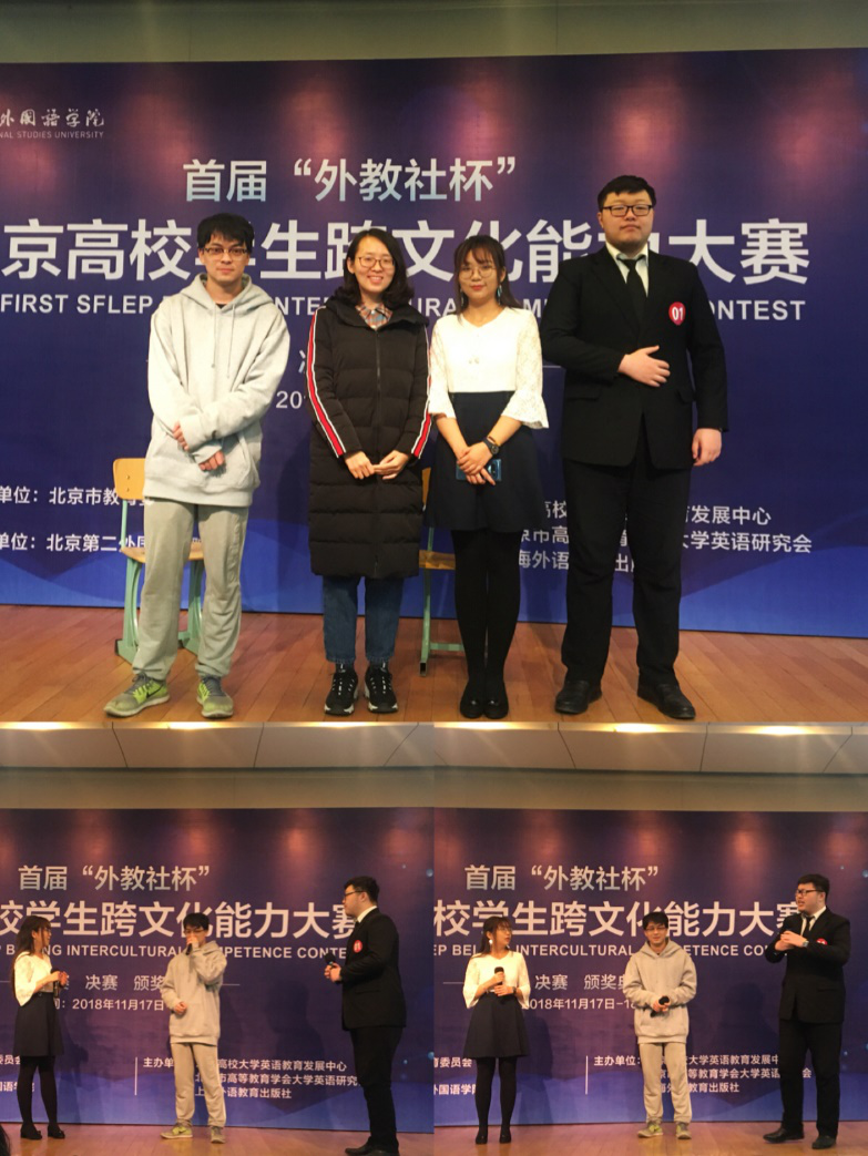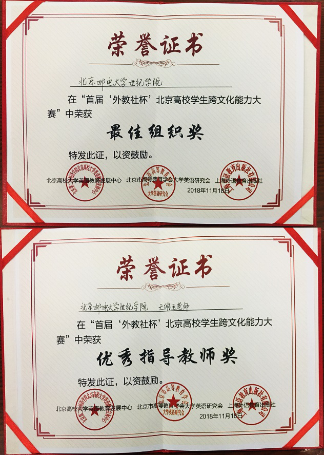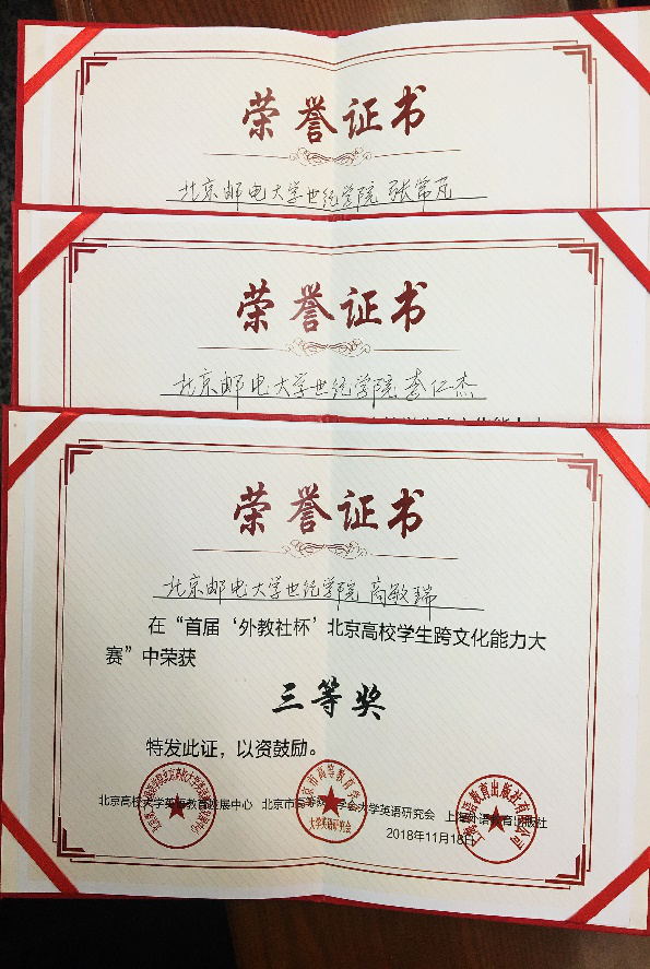 11月17-18日,在首屆“外教社杯”北京高校學生跨文化能力大賽中,由學院2017級電子信息工程專業的李仁杰、市場營銷專業的張常芃以及傳播學專業的高敏瑞同學組成的代表隊榮獲三等獎,學院榮獲“最佳組織獎”,英語專業教研室王佩玉老師榮獲“優秀指導教師獎”。