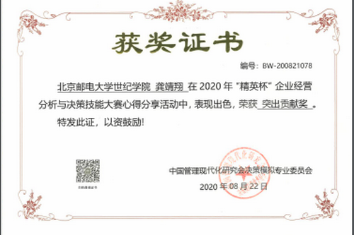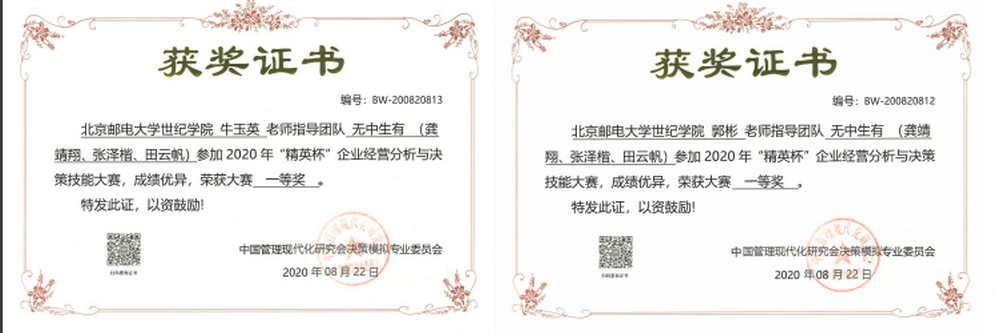 2020年8月22日,2020年“精英杯”企業(yè)經(jīng)營(yíng)分析與決策技能大賽落下帷幕。我院牛玉英老師、郭彬老師指導(dǎo)帶領(lǐng)的龔靖翔、張澤楷、田云帆三位經(jīng)管系同學(xué)組成的“無(wú)中生有”隊(duì)在全國(guó)232支隊(duì)伍中脫穎而出,榮獲一等獎(jiǎng)。龔靖翔同學(xué)榮獲突出貢獻(xiàn)獎(jiǎng)。此次比賽由中國(guó)管理現(xiàn)代化研究會(huì)決策模擬專業(yè)委員會(huì)主辦、企業(yè)經(jīng)營(yíng)分析與決策技能大賽組委會(huì)承辦,北京金易博文科技有限公司提供技術(shù)支持。據(jù)統(tǒng)計(jì),本屆大賽有效報(bào)名隊(duì)伍232支,覆蓋21個(gè)省市自治區(qū),67所高校。經(jīng)初賽、復(fù)賽、決賽三輪對(duì)抗,決出一等獎(jiǎng)18名,二等獎(jiǎng)49名,三等獎(jiǎng)81名。