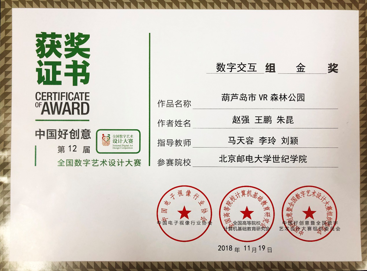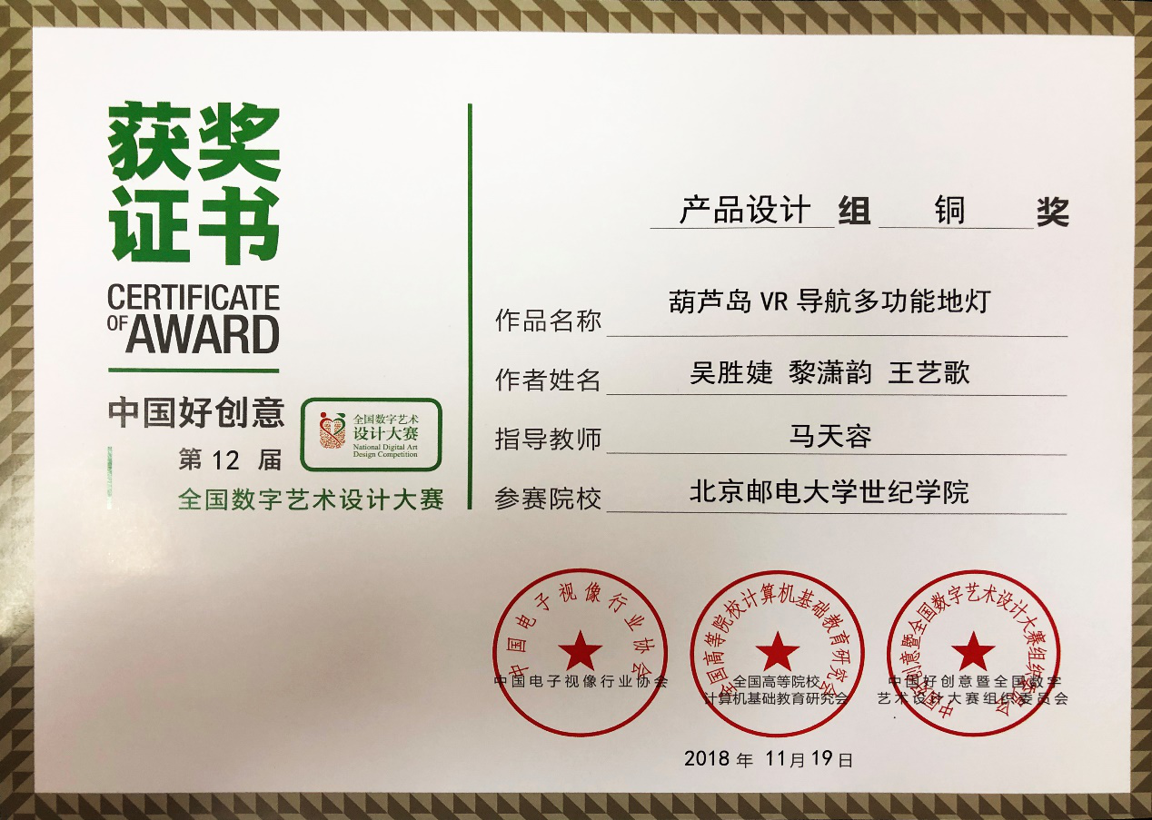 11月30日—12月1日,在第十二屆中國數字傳媒教育與發展論壇年會暨“葫蘆島杯”中國好創意第十二屆全國數字藝術設計大賽中,藝術與傳媒學院幻時代工作室的同學們在馬天容、李玲、劉穎老師的耐心指導下,利用課余時間精心打磨作品,最終獲得金獎、銅獎2項大獎。