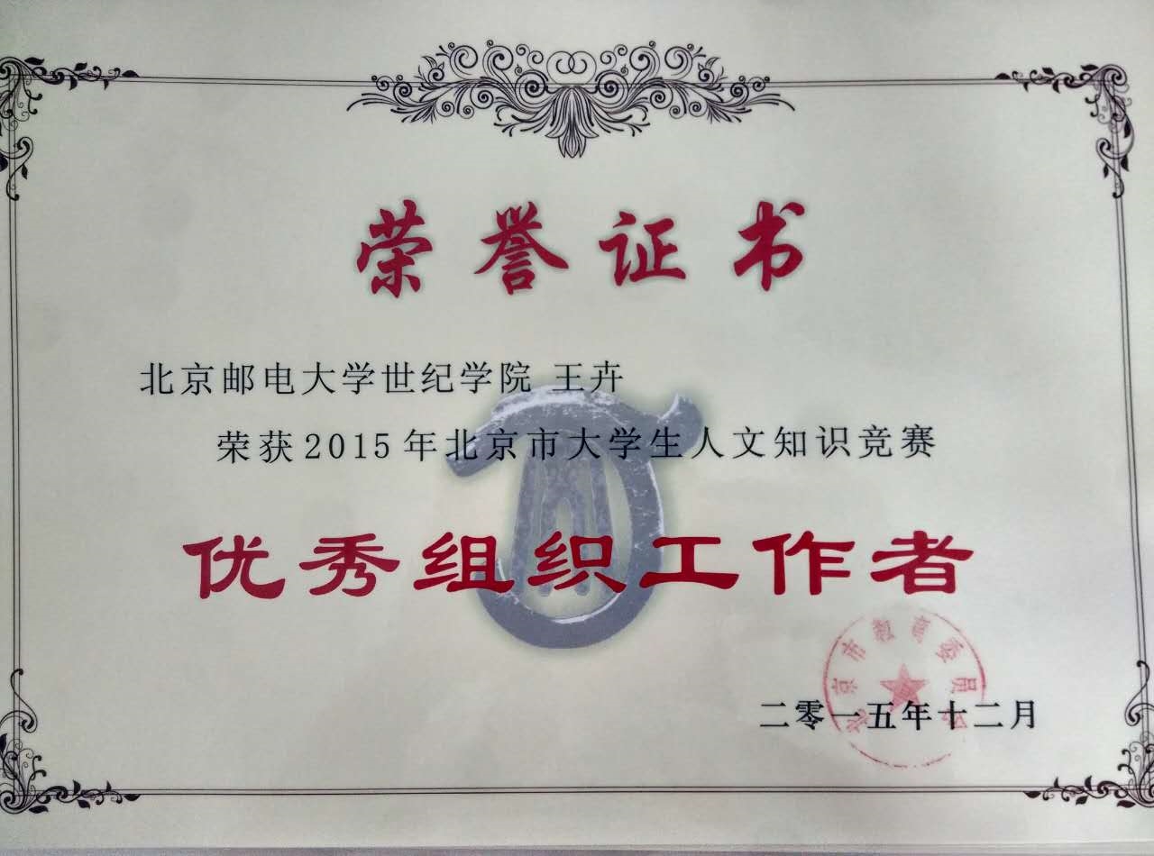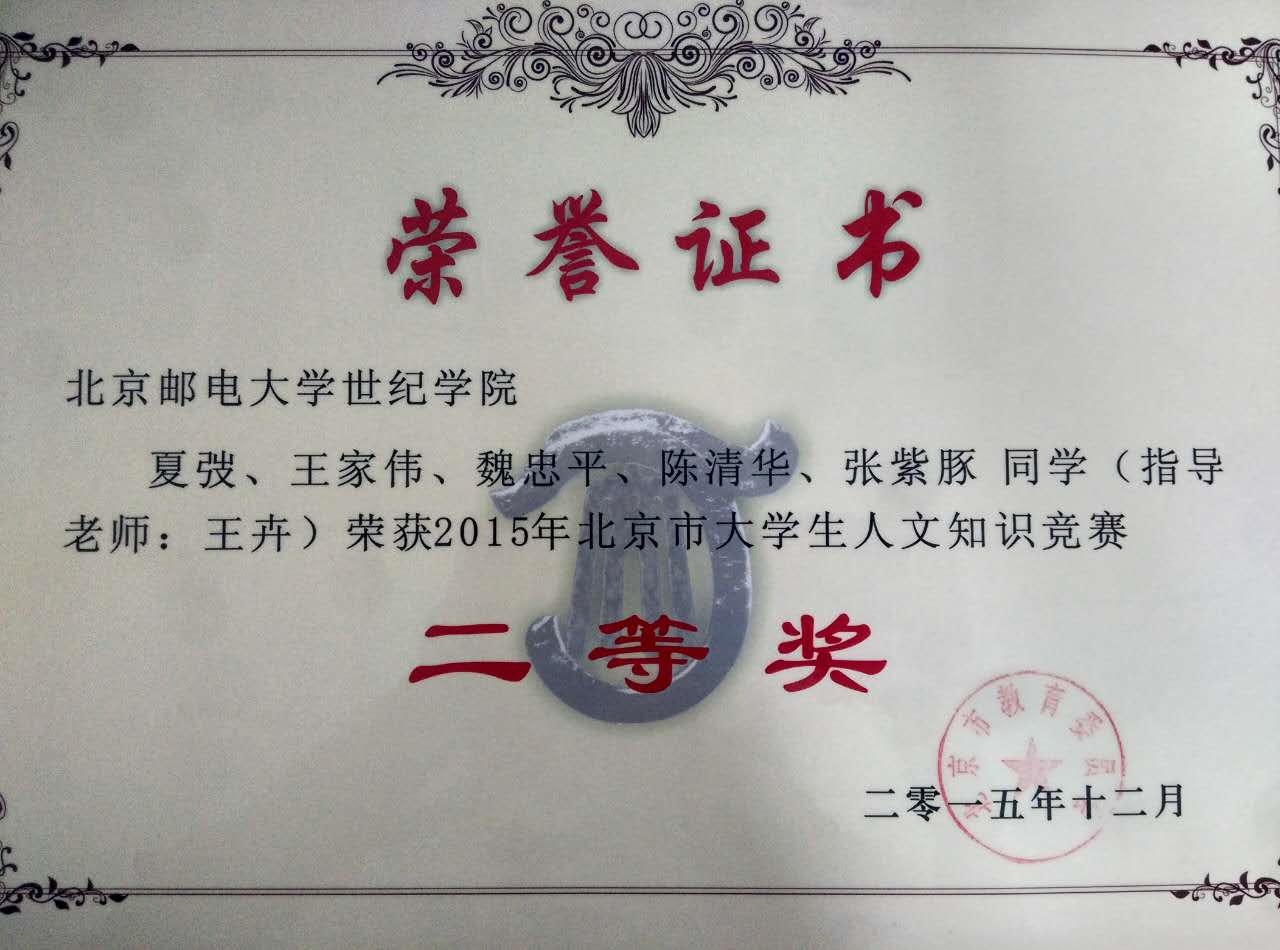 近日,北京市教委對(duì)第七屆北京市人文知識(shí)競(jìng)賽獲獎(jiǎng)隊(duì)伍頒發(fā)了獲獎(jiǎng)證書。本屆賽事共有80余支隊(duì)伍參與角逐,我院代表隊(duì)在該項(xiàng)競(jìng)賽中取得歷史性突破。其中本科生夏弢帶領(lǐng)的北郵世紀(jì)1隊(duì)以優(yōu)異成績(jī)斬獲二等獎(jiǎng),與清華大學(xué)、中央民族大學(xué)等國(guó)內(nèi)知名院校并列。以本科生何思思帶領(lǐng)的北郵二隊(duì)斬獲南片區(qū)賽二等獎(jiǎng)。同時(shí),因?yàn)樵谠擁?xiàng)賽事中的貢獻(xiàn),北郵世紀(jì)榮獲本屆北京市大學(xué)生人文知識(shí)競(jìng)賽“優(yōu)秀組織獎(jiǎng)”;學(xué)生處處長(zhǎng)王卉榮獲“優(yōu)秀組織工作者”稱號(hào)。