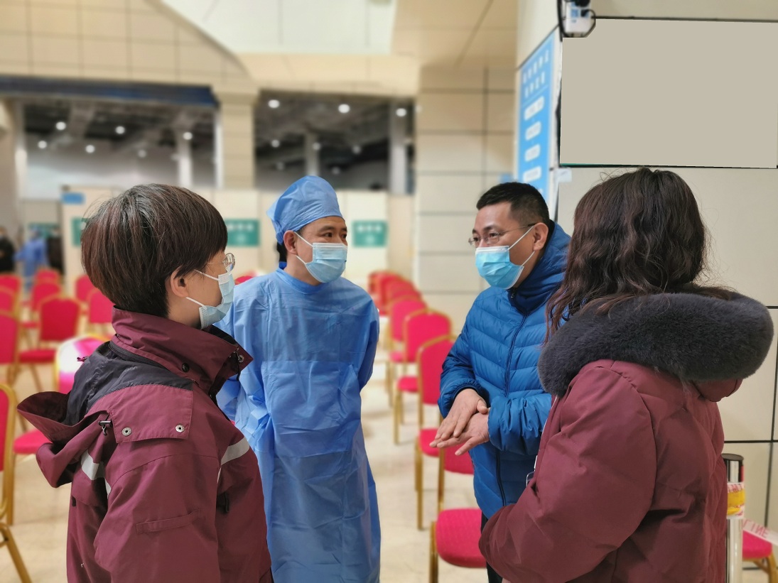學(xué)院謝苗峰書(shū)記(右2)與疾控中心申赟魁副主任(左1)、中醫(yī)院姜志輝副院長(zhǎng)(左2)就接種情況進(jìn)行交流