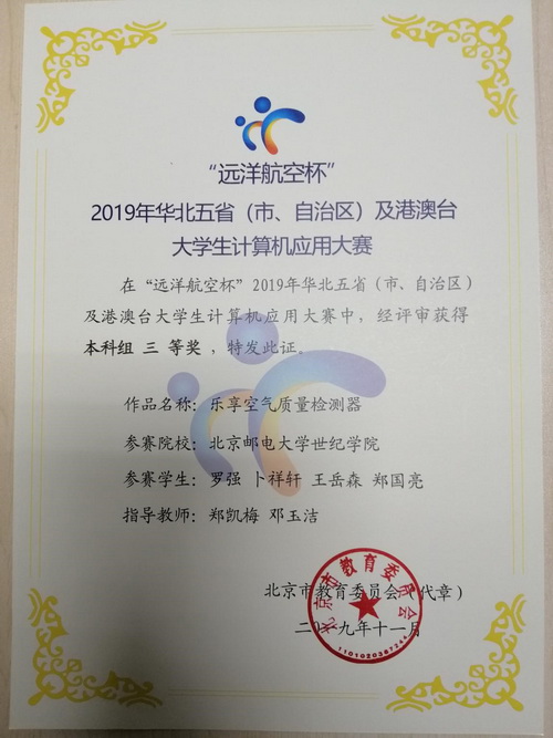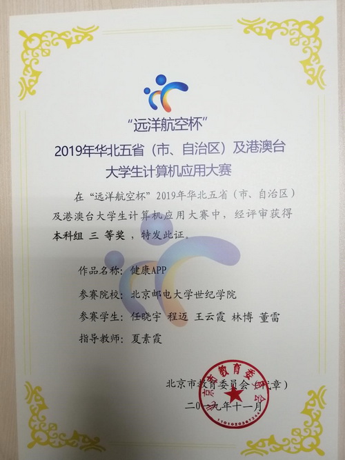 2019年11月16日上午,由北京市教委等聯(lián)合主辦的“遠(yuǎn)洋航空杯”2019年華北五省(市、自治區(qū))及港澳臺(tái)大學(xué)生計(jì)算機(jī)應(yīng)用大賽總決賽在北京聯(lián)合大學(xué)北四環(huán)校區(qū)隆重舉行。我院的參賽作品“健康A(chǔ)PP”和“樂享空氣質(zhì)量檢測(cè)器”順利晉級(jí),均榮獲本科組三等獎(jiǎng)。此次競(jìng)賽以“移動(dòng)互聯(lián)網(wǎng)應(yīng)用創(chuàng)新”為主題,緊密結(jié)合智能硬件、移動(dòng)終端應(yīng)用及各行各業(yè)對(duì)軟件作品的需求,使學(xué)生能夠?qū)⒗碚撝R(shí)與實(shí)踐相結(jié)合,有利于培養(yǎng)、鍛煉大學(xué)生的創(chuàng)新意識(shí)、創(chuàng)意思維與設(shè)計(jì)和創(chuàng)業(yè)能力。