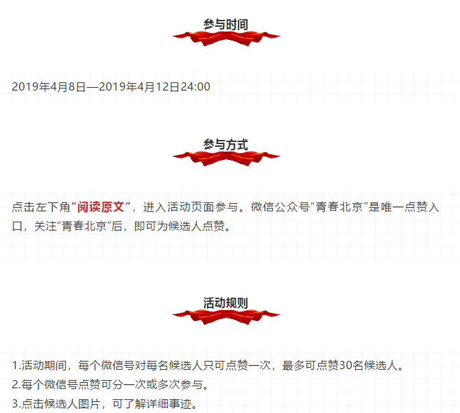 王禹勛本次入選“第三十三屆北京青年五四獎章”評選,請我校師生為其投上寶貴的一票,投票方法:關注“青春北京”微信公眾號,即可為候選人【1號王禹勛】投票。