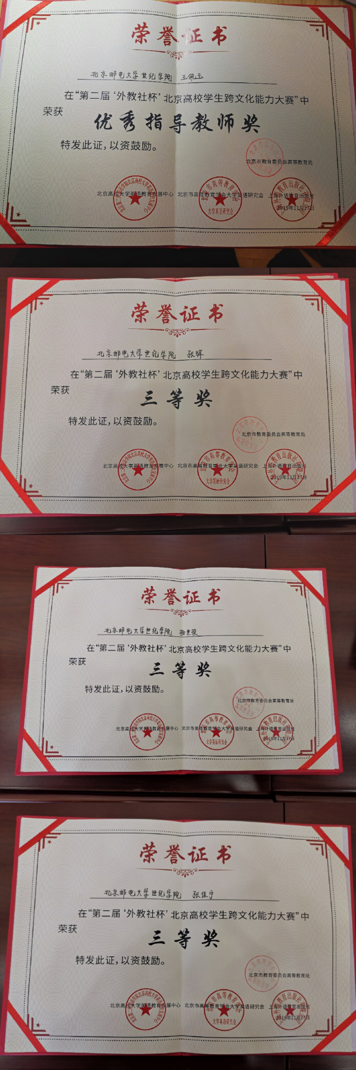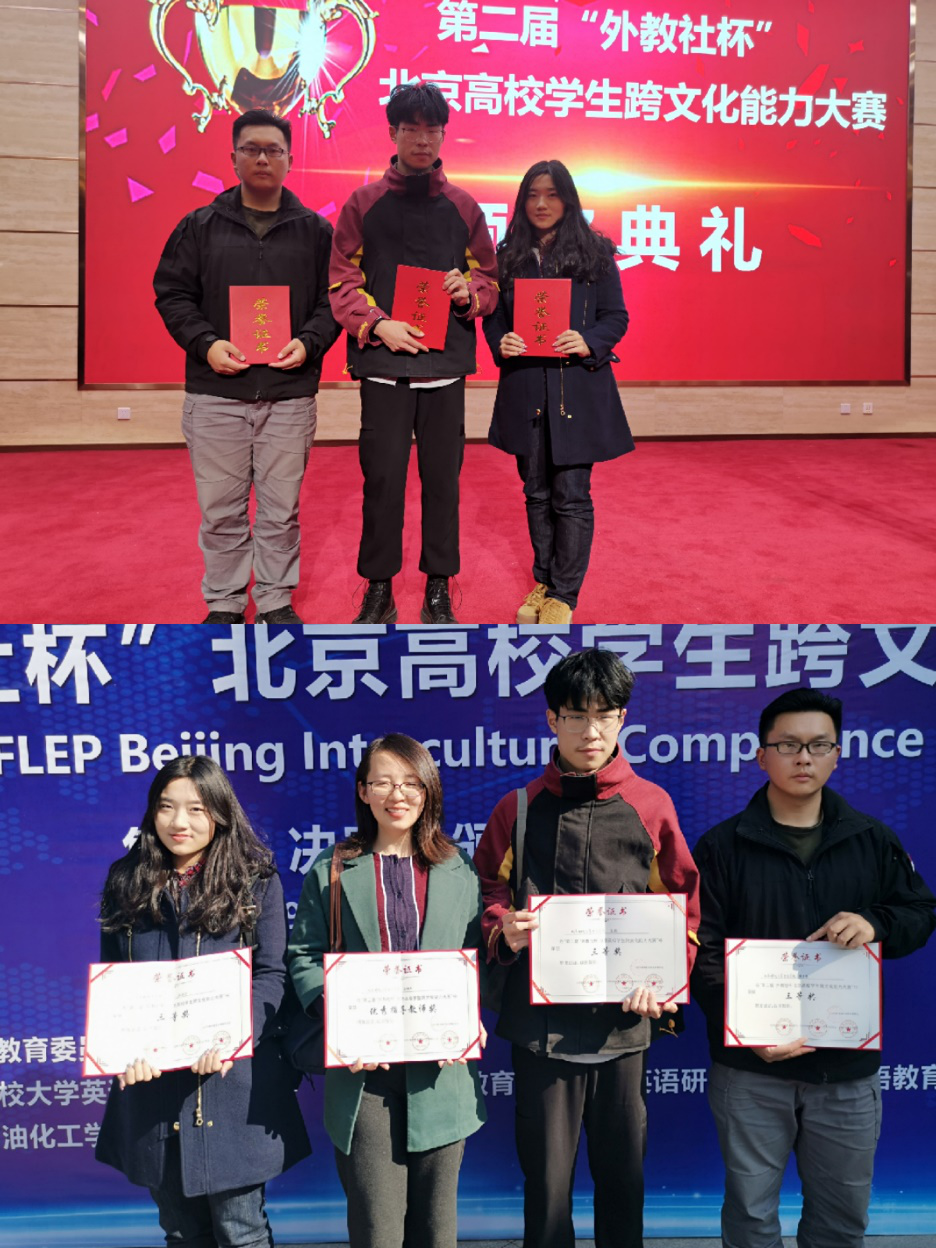 10月26日-27日,由北京市教育委員會高等教育處指導,北京高校大學英語教育發展中心、北京市高等教育學會大學英語研究會和上海外語教育出版社主辦,北京石油化工學院承辦的第二屆“外教社杯”北京市高校學生跨文化能力大賽在北京石油化工學院舉行。來自中國人民大學、對外經濟貿易大學、北京郵電大學、北京交通大學等北京市32所高校代表隊的96位英語專業及非專業選手同臺競技。我校外語系英語專業18-01班學生張輝、楊世梁和經管系財務管理18-02班學生張佳寧組成的代表隊表現優秀,最終榮獲本次大賽的三等獎。外語系王佩玉老師獲得優秀指導教師獎。