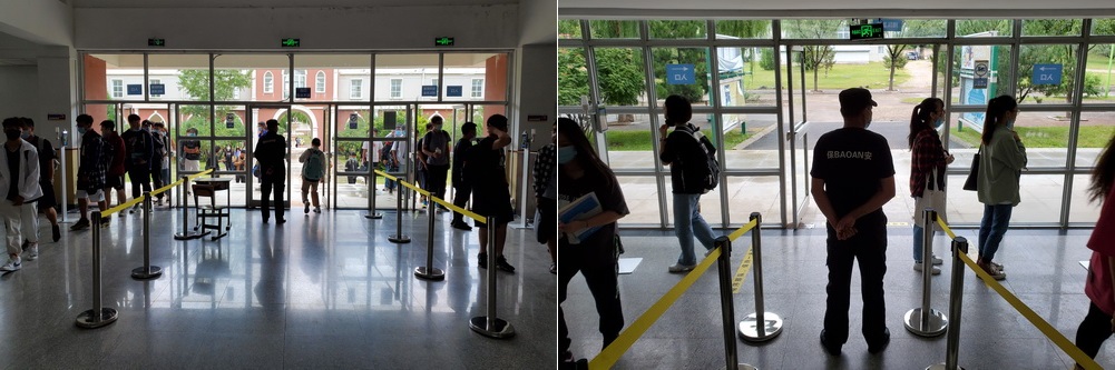 2020年8月31日上午8:00,新學年開學伊始,學院副院長夏素霞、教務處及各教學單位相關負責同志一行來到教學樓前,與同學們共同迎接新學期的到來。學院分別在教學樓進出口張貼了警示標志和距離標簽,做到進出有序、出入分開。入口兩側都配備了溫控監測儀,師生進出教學樓需要掃描識別身份并測量體溫。2019級師生掃描通過后相繼進入教室。8:30上課鈴聲響起,同學們間隔坐好,回歸到正常的課堂學習中來,上好2020年的“第一堂”課。