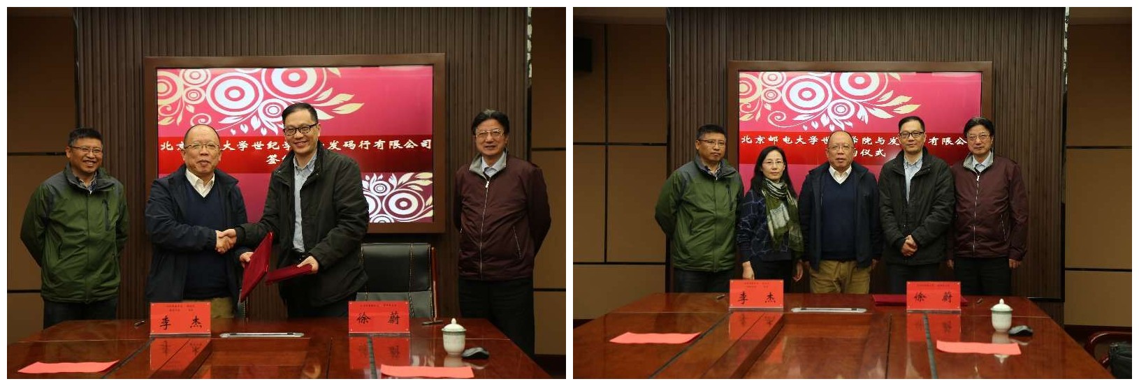 北京郵電大學副校長、學院院長李杰,發碼行有限公司董事局主席徐蔚,學院副院長夏素霞,電子與自動化系主任周曉光,通信與信息工程系副主任劉剛等出席了簽約儀式。(教務處供稿)