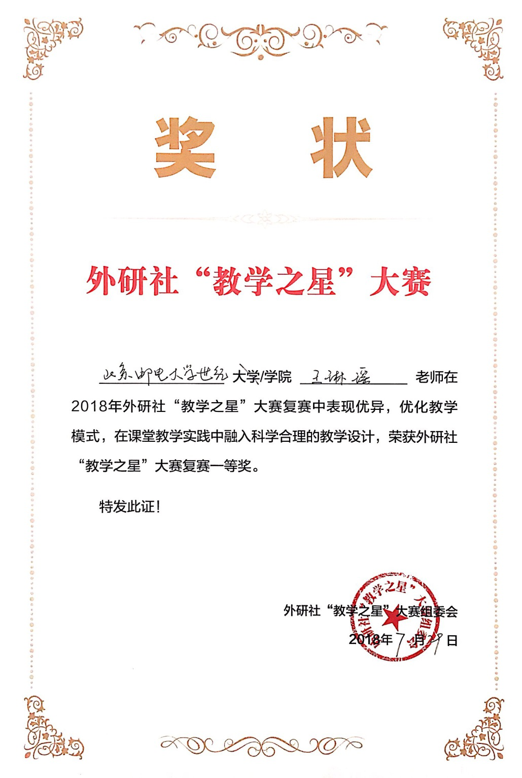 7月27-31日,在2018年外研社全國高等學校英語專業教學發展與創新研修班暨“教學之星”大賽(英語專業組)中,外語系青年教師王琳瑤憑借扎實的專業功底與出眾的教學能力,獲得復賽一等獎。