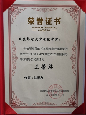 胡桐彬老師被評為2020年全國民辦高校優秀輔導員,時任學生處副處長沙招友代表學院申報的《本科教育合理增負的隱形社會價值》論文榮獲2020年全國民辦高校優秀論文三等獎。