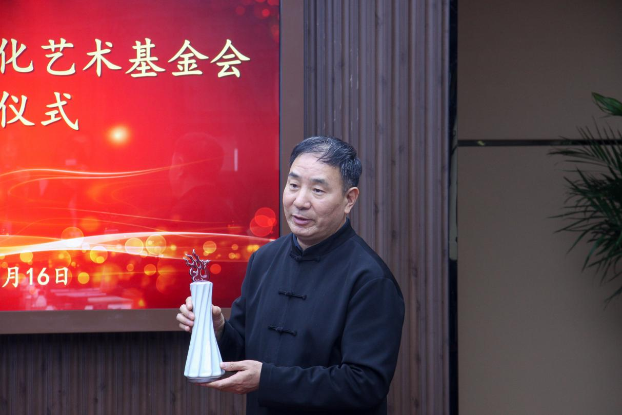 在隨后舉行的捐贈儀式上,謝苗峰院長代表學院接受贈書、捐贈書,同時向基金會頒發收藏證書并將代表深刻寓意的鈞瓷作品《師魂》作為回禮敬贈。