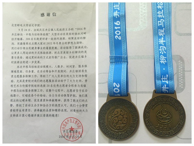 近日,因在9月24日“2016年井莊柳溝半程馬拉松體驗跑”志愿服務活動中表現優異,活動主辦方和協辦方特地為傳媒學院送來感謝信,這是對傳媒學院志愿者們辛勤工作的充分肯定。以此為契機,傳媒學院將在今后的志愿服務中,把“有責任、講奉獻”的優良品質繼續發揚下去。(藝術與傳媒學院趙鑫 供稿)