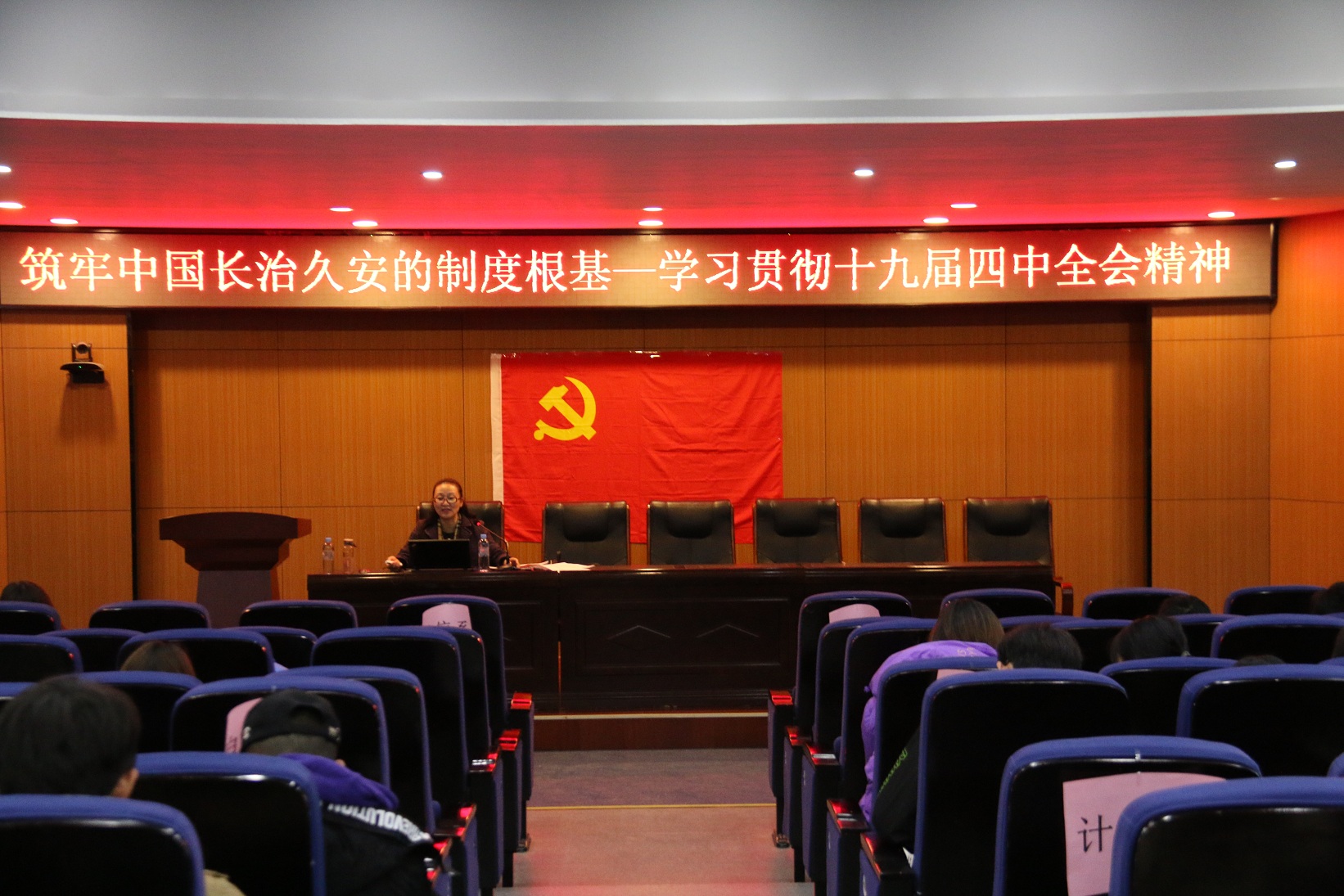 繼學院黨委書記謝苗峰為重點發展對象、第十九期黨校學員上題為《固本強基,與中國夢同行》的主題黨課后,11月28日晚學院黨校又邀請到了學工部部長、學生處處長張秀芬為學員們講題為《筑牢中國長治久安的制度根基——學習貫徹十九屆四中全會精神》的黨課,大家深受鼓舞,頗多感悟。