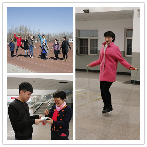 隨著圖書館內的美妝選手們陸續完成了妝容,12時整,“魅力四射”健身大賽終于在大眾的期待中吹響了號角。健身大賽包含跳繩或踢毽子、運動場快走、筷子擲準、尋找美妝模特四個環節,全部完成需要經過明德樓、行知樓、運動場和圖書館,選手們圍繞校園健身一圈,各個氣喘吁吁大呼過癮。本次比賽還特別邀請了男教職工參與,使得場面更加趣味橫生,氣氛和諧歡快。