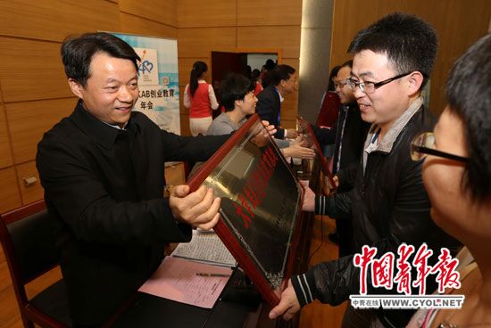 4月14日,2015年KAB創業教育年會在四川大學召開。團中央書記處書記傅振邦為獲得KAB創業教育基地的學校授牌。本報記者 李建泉/攝