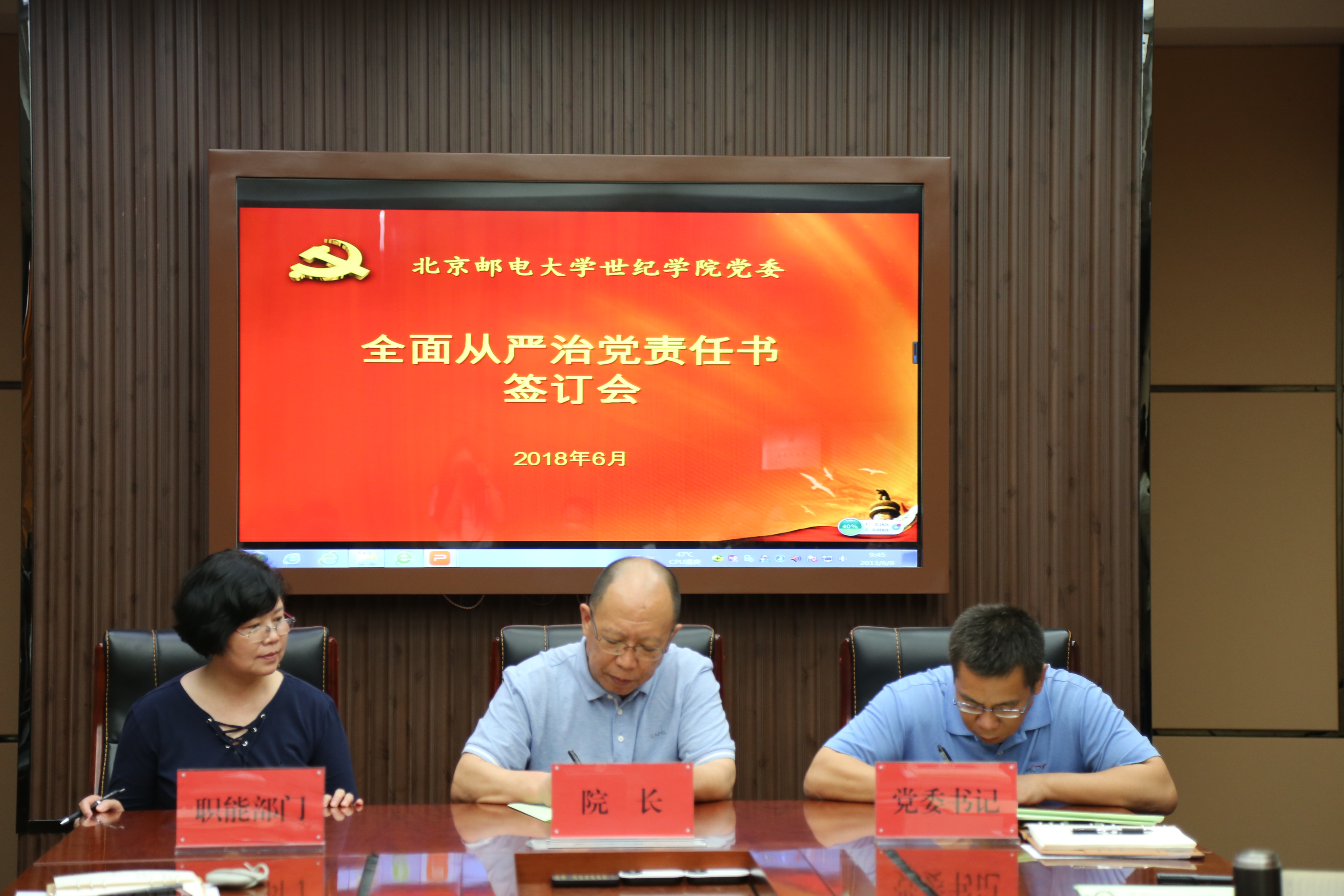 全面從嚴(yán)治黨責(zé)任書簽訂儀式后,為落實市委教育工委、市教委關(guān)于《2018年北京高校維護(hù)安全穩(wěn)定工作要點》文件精神,結(jié)合學(xué)院實際,李杰院長、謝苗峰書記同職能部門、教學(xué)單位負(fù)責(zé)人代表簽訂了《安全責(zé)任書》。(綜合辦季書一 供稿)