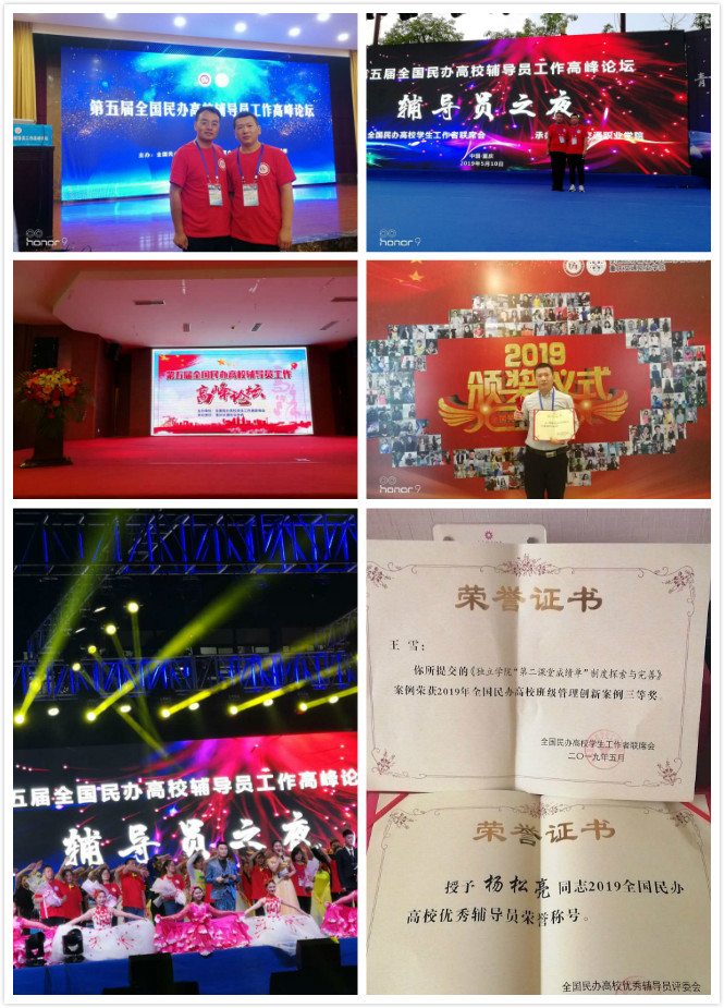 5月10日-11日,第五屆全國民辦高校輔導員工作高峰論壇在重慶隆重召開,論壇由全國民辦高校學生工作者聯席會主辦、重慶交通職業學院承辦,來自全國近200所民辦高校420名民辦高校學生工作主管領導、學生處長及骨干輔導員參加論壇。我院派計算機科學與技術系副主任張敏杰和通信與信息工程系輔導員楊松亮參會。其中,楊松亮被評為2019年全國民辦高校優秀輔導員。在“第二屆全國民辦高校班級管理創新案例征集活動”中,我院藝術與傳媒學院輔導員王雪代表學院申報的《獨立學院“第二課堂成績單”制度探索與完善》榮獲2019年全國民辦高校班級管理創新案例三等獎。