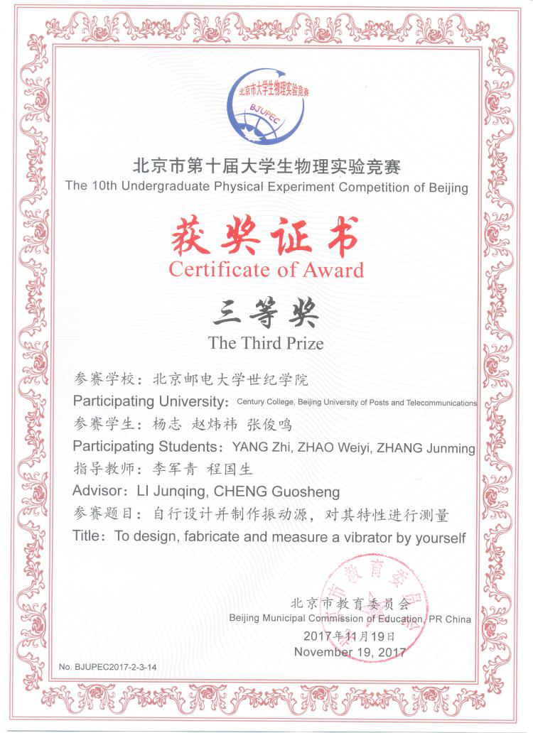 近日,在第十屆北京市大學生物理實驗競賽中,我院俞婷等同學完成的“液體折射率自動測量儀”、韓曉月等同學完成的“利用電容器的原理搭建實驗裝置,測量某些物理參數”、楊志等同學完成的“自行設計并制作振動源,對其特性機型測量”項目均獲得了三等獎。