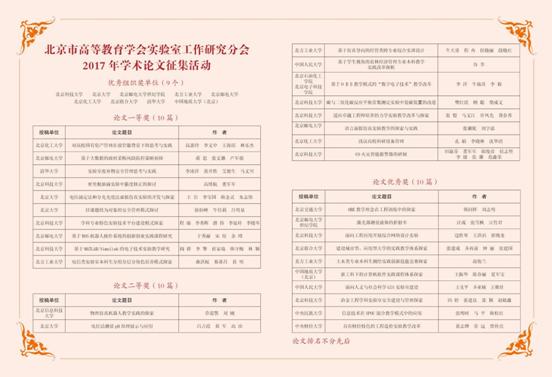 本次論文征集活動于2017年秋季學期完成,征文活動得到了學院教師們的積極響應,所有投稿論文已全部收入《北京高等教育學會實驗室工作研究分會2017年度學術年會論文集》。作為實驗室工作研究會的理事單位,學院一直以來積極參與相關活動,并通過研究會平臺不斷與其他高校開展交流學習。