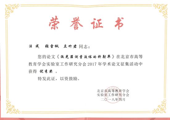 近日,在北京高等教育學會實驗室工作研究分會2017年度學術研討會征文評選活動中,學院汪成、張雪楓、豆竹君3位教師撰寫的《激光器測量液體的折射率》獲得論文優(yōu)秀獎,學院獲得優(yōu)秀組織獎。