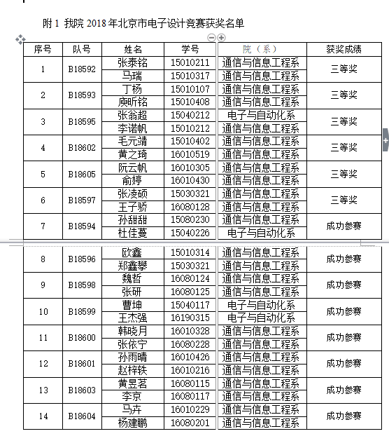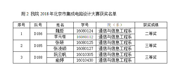 近日,學院先后在2018年北京市大學生電子設計競賽中獲得三等獎6項共12人、成功參賽獎8項,在北京市集成電路設計大賽獲得二等獎1項,三等獎2項。