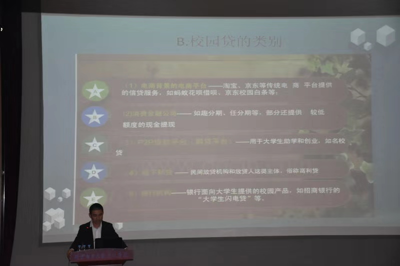 接下來介紹了校園套路貸,是一些網(wǎng)絡(luò)貸款平臺(tái)向大學(xué)生開展的貸款業(yè)務(wù),也介紹了校園貸的類別,其中舉了案例來分析,校園貸存在極大風(fēng)險(xiǎn)其中分為裸貸等,以借債人的照片作為威脅以及視頻威脅等。他指出,作為當(dāng)代大學(xué)生應(yīng)該理性費(fèi)抵制各類非法網(wǎng)貸行為,通過正規(guī)公司機(jī)構(gòu)辦理助學(xué)貸款。