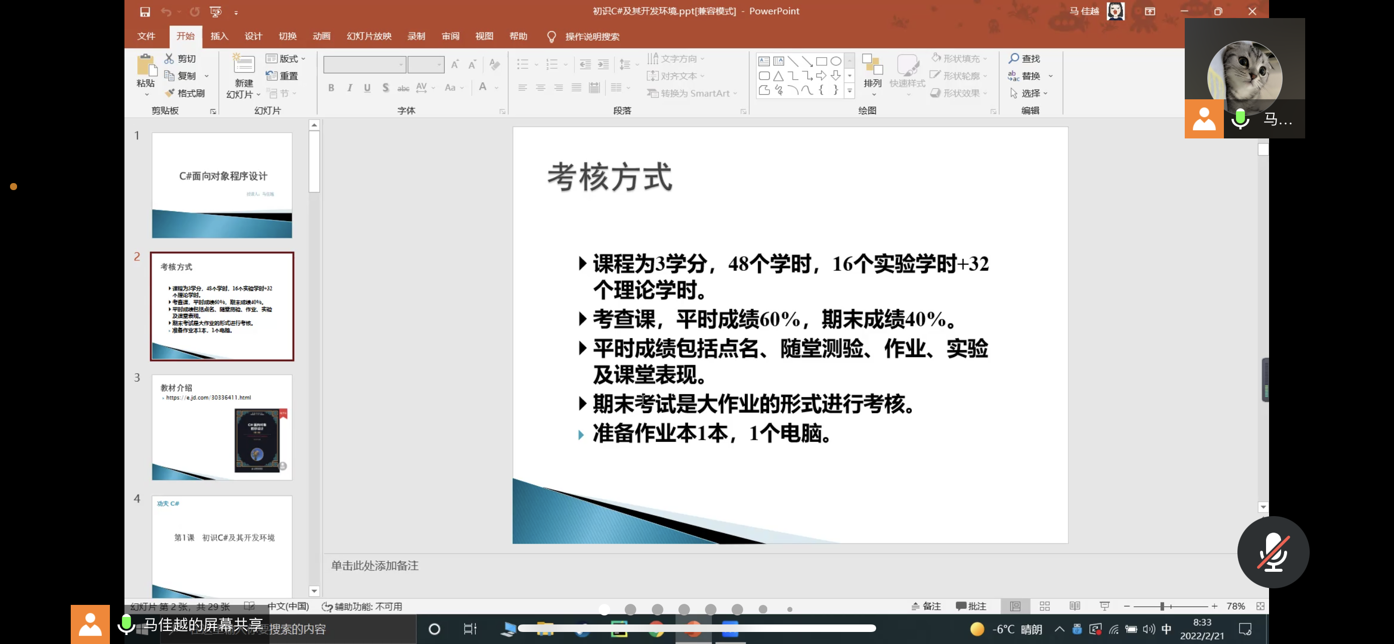 有了去年線上教學的經驗,經過前期周密的安排及測試,早上8:30,新學期的第一課正式開始。老師們首先對學生進行了思政教育,就當前疫情形勢進行了分析,并叮囑學生要嚴格落實國家疫情防控要求,盡量減少出行。其中,馬佳越老師在第一堂課加入了“C#”的發展和應用,增強了同學們對該語言的認知和興趣;王宇博老師在課堂伊始講解了課程的地位和作用,為后續的學習明確了方向;盛海燕老師首先講解了相對簡單的知識點,加強同學們對課程內容的學習目的性;史宏宇老師課前講解了課程的作用和考核情況,為同學們后續的學習明確了方向。雖然疫情延緩了返校,但是老師和同學們依然以飽滿的熱情對待線上課堂。