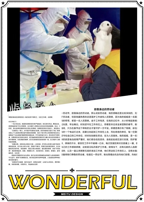 以夢為馬,以勞為韁。勞動者用勤勞的雙手和智慧,編制了這個五彩斑斕的世界,創造了人類文明。讓我們在這個特別的日子里,向全世界的勞動者致敬。此次活動在5月1日正式展開,同學們收集身邊勞動人民的一點一滴。有辛苦的醫護人員“大白”,有恪守崗位的交警叔叔,有默默無聞的志愿者,也有在高溫下仍然勞作的施工人員...... 這些光榮的勞動模范們在平凡的崗位上,用辛勤勞動,贏得了榮光,贏得了尊敬!同學們記錄下一段又一段勞動者的vlog,每一幀的畫面無不記錄著勞動者對生活的熱愛,對美好的憧憬。同學們認真記錄,精心剪輯,即使沒有華麗的文案和旁白,每一個鏡頭都是對勞動者崇高的敬意。
