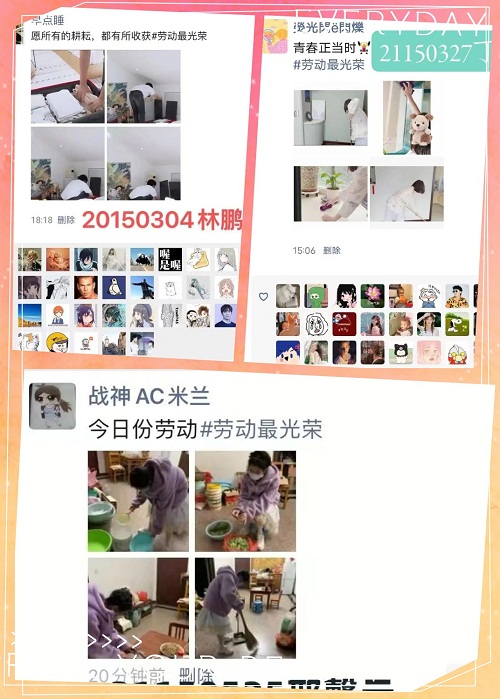 在勞動節當天,同學們分別進行了不同的家務勞動。親身參與勞動,自己享受勞動成果,感受勞動的魅力,為父母分擔家務。有打掃房間的,有幫忙拖地的,有幫忙洗碗的,有擦拭櫥窗的。同學們認真參與勞動并錄制視頻,在家勞動,為疫情居家的學習生活增添一抹潔凈,同時感受生活中勞動的滋味。大家通過發布關于勞動話題的朋友圈,向身邊人傳達勞動的重要性,以行動傳達“勞動光榮”的理念。培養勞動觀念,樹立勞動習慣。