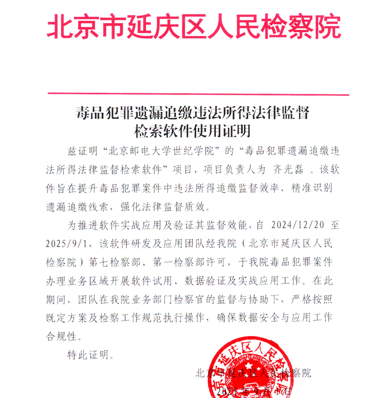 在深化黨建與科研融合、拓展校企(檢)合作的實踐中,學院計算機科學與技術系教工黨支部充分發揮專業優勢,聯合地方檢察院協同攻關,牽頭研發的“大數據賦能刑事審判監督”成果——“毒品犯罪遺漏追繳違法所得法律監督檢索軟件”項目,獲評北京市檢察機關數字檢察典型案例,入選最高檢大數據法律監督模型平臺,在全國檢察機關推廣應用,為法治建設注入智能高效的“紅色動能”,彰顯了黨建引領下校檢合作的堅實成效與深遠價值。