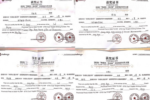 我院外語系2019級英語專業學生李冠奇、林怡同學在“外研社·國才杯”校內選拔中脫穎而出,并于2020年10月31日參加北京市復賽,與來自北京外國語大學、中國人民大學、對外經濟貿易大學等多所國內知名院校的100名優秀學子同臺競技,獲得北京市賽區復賽三等獎,指導教師王佩玉榮獲北京市賽區指導教師三等獎。