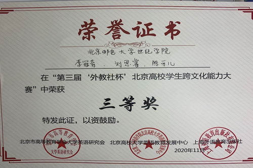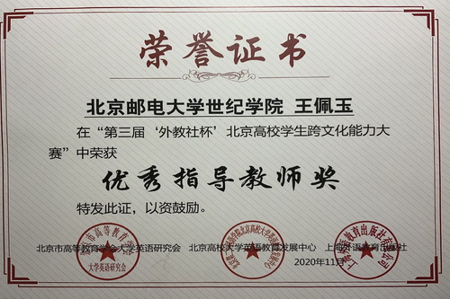 2020年11月28日,第三屆“外教社杯”北京高校學(xué)生跨文化能力大賽頒獎典禮在北京市麗亭華苑酒店舉行。經(jīng)過前期的激烈角逐,我院組建的北郵世紀(jì)代表隊(duì)榮獲本次大賽“三等獎”,英語專業(yè)教師王佩玉榮獲本次大賽 “優(yōu)秀指導(dǎo)教師獎”。