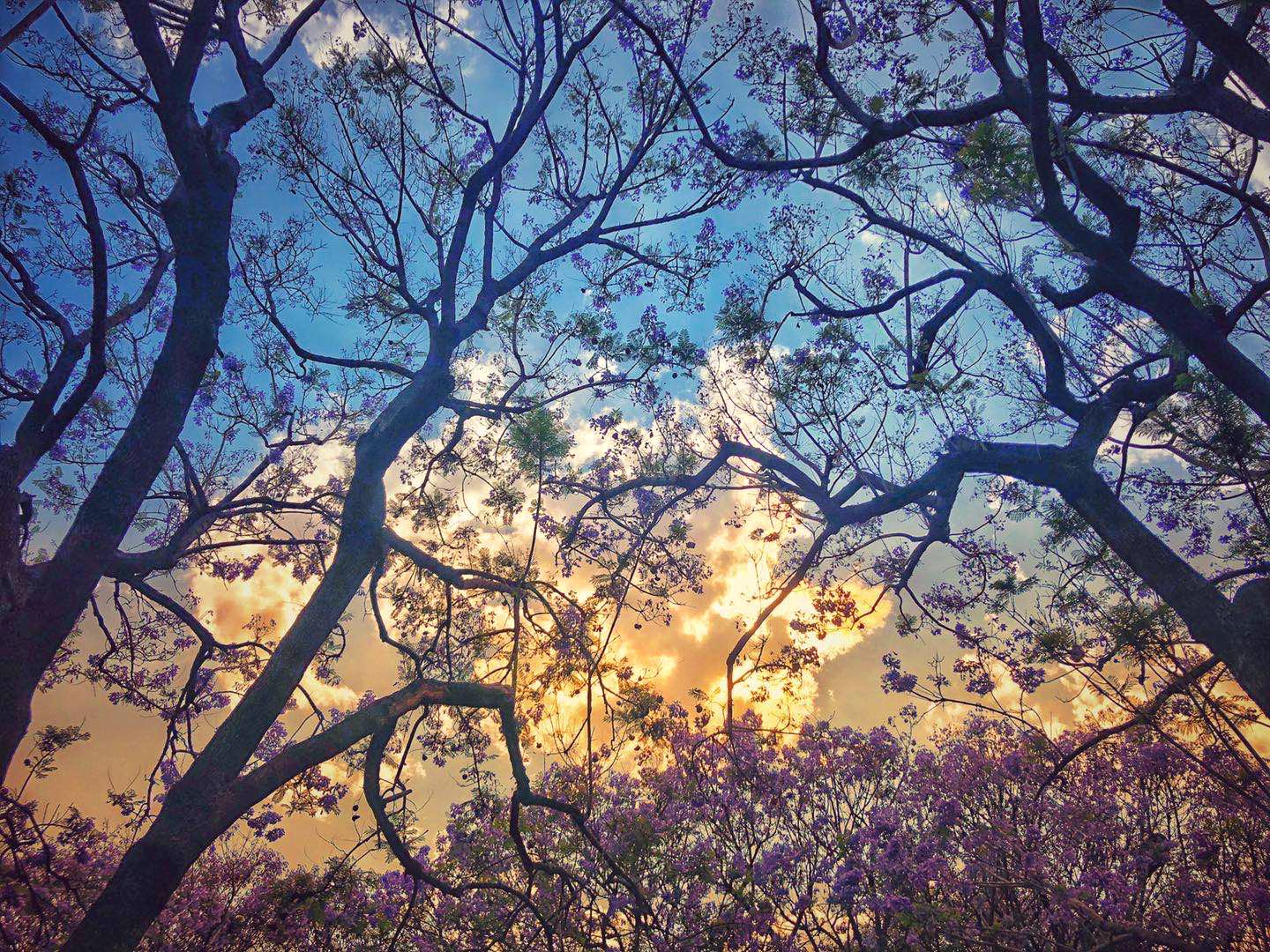 黃佳同學在照片中傳遞:在藍花楹不會缺席的春日,天空被染成了藍紫色,夕陽下落日的余暉便是那世間隨處可見的溫柔美好。