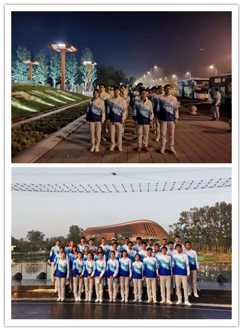 我們站在以國槐為主的小萌芽和以月季為主的小萌花的中間,左手伸向和諧美好的生活,右手握向綠色健康的家園,書生意氣,揮斥方遒。滿是光芒與活力。我們又來到媯汭湖畔,迎著漸漸熹微明朗的天,站成隊列,準備在媯汭劇場迎接第一縷陽光。