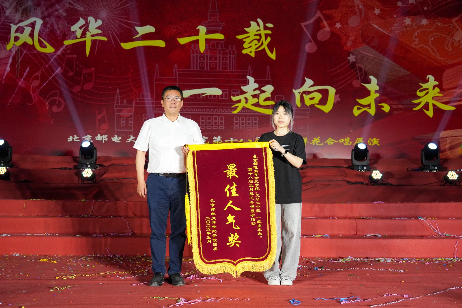 精彩的合唱展演結束后,活動進入頒獎環節。本次比賽共設置青春飛揚獎、激情綻放獎、璀璨星光獎、活力閃耀獎、陽光風采獎、魅力之星獎六個基礎獎項,以及備受矚目的“最佳人氣獎”。其中,“最佳人氣獎”通過“莘莘世紀”公眾號鏈接投票產生,經過激烈的角逐,經濟管理系憑借出色的舞臺表現與廣泛的號召力,以5712票的優異成績脫穎而出,榮獲“最佳人氣獎”。學院院長謝苗峰、黨委書記王常軍分別為獲獎代表頒獎。