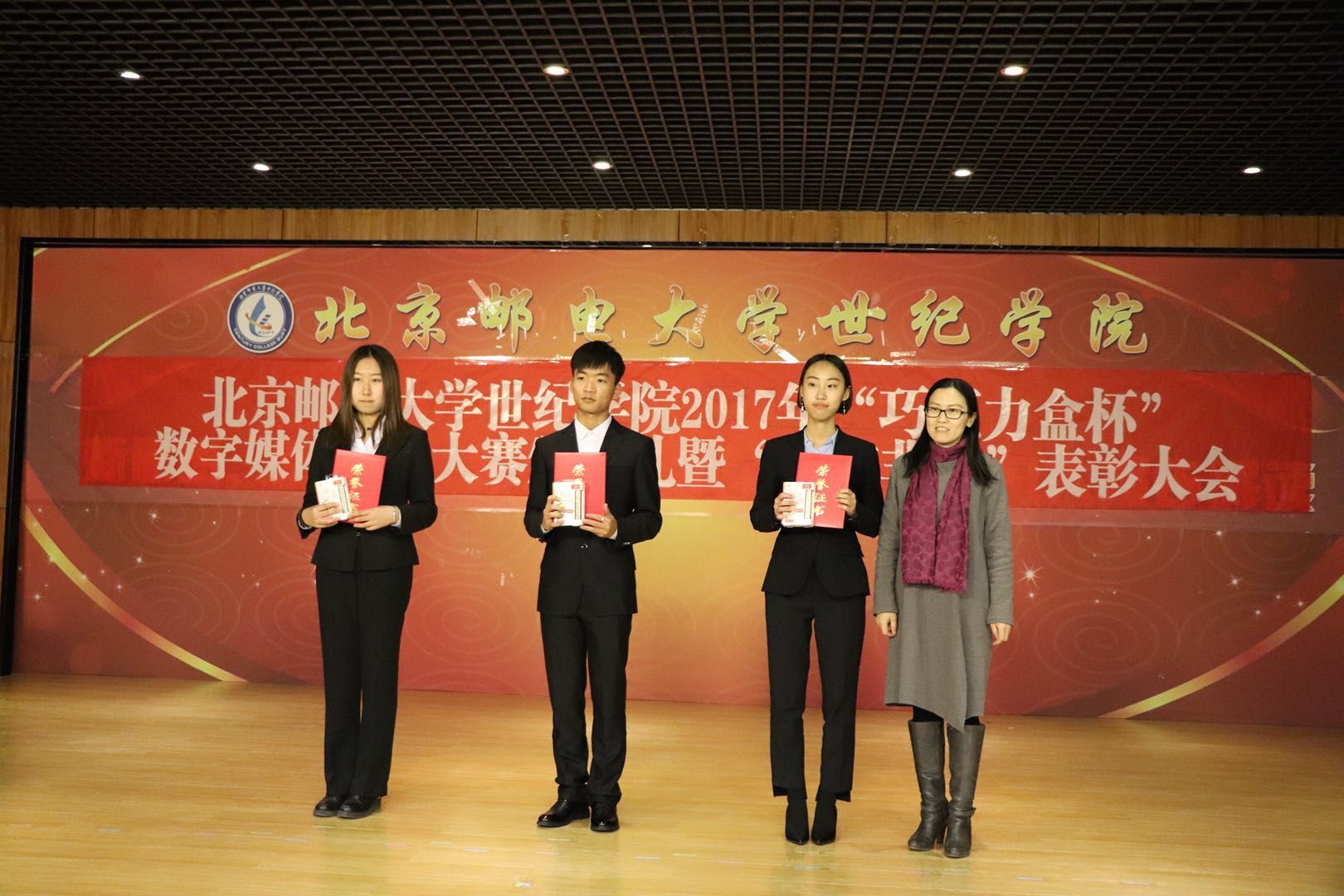 12月6日下午,由藝術與傳媒學院承辦、巧克力盒(北京)文化傳媒公司大力支持的2017年“巧克力盒”杯數字媒體設計大賽頒獎典禮在學思樓127報告廳成功舉辦。我院副院長、大賽組委會主任夏素霞,巧克力盒(北京)文化傳媒有限公司副總經理柴家川,學院教務處副處長張長江,藝術與傳媒學院院長淮永建、副院長陳薇、團總支書記趙鑫及傳媒學院全體教師出席頒獎典禮。