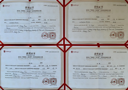 本次閱讀大賽包括“讀以明己”、“讀以察世”、“讀以啟思”、“讀以言志”四個(gè)模塊,我院外語(yǔ)系2017級(jí)英語(yǔ)專業(yè)學(xué)生王帆、鄂雪與來(lái)自北京外國(guó)語(yǔ)大學(xué)、中國(guó)人民大學(xué)、北京郵電大學(xué)等多所國(guó)內(nèi)著名高校的優(yōu)秀學(xué)子同臺(tái)競(jìng)技英語(yǔ)表達(dá)能力,最終喜獲北京賽區(qū)復(fù)賽三等獎(jiǎng)的好成績(jī),指導(dǎo)教師張艷榮獲北京賽區(qū)指導(dǎo)三等獎(jiǎng),這與外語(yǔ)系“教學(xué)與賽事兩手抓”的扎實(shí)工作是分不開的。