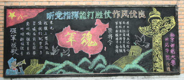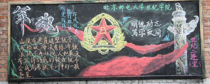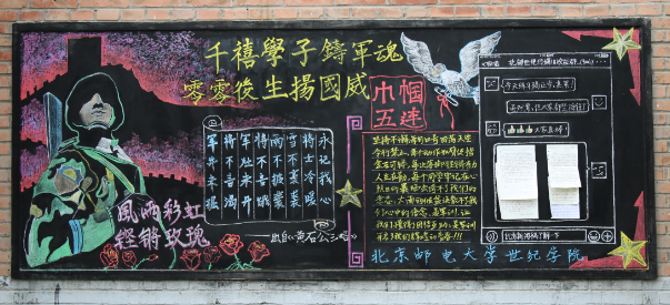 板報評比活動旨在增強同學們的團隊精神,激發學員們的軍訓熱情,鼓舞學員們的士氣,使學員們在緊張的訓練之余,能放松自我,豐富軍營文化,更好的體會軍訓生活。 (北郵世紀軍訓團 供稿)