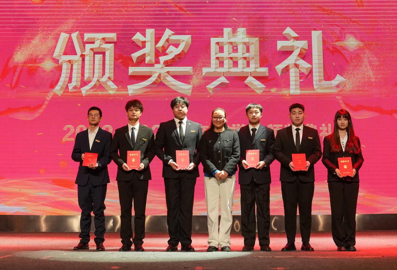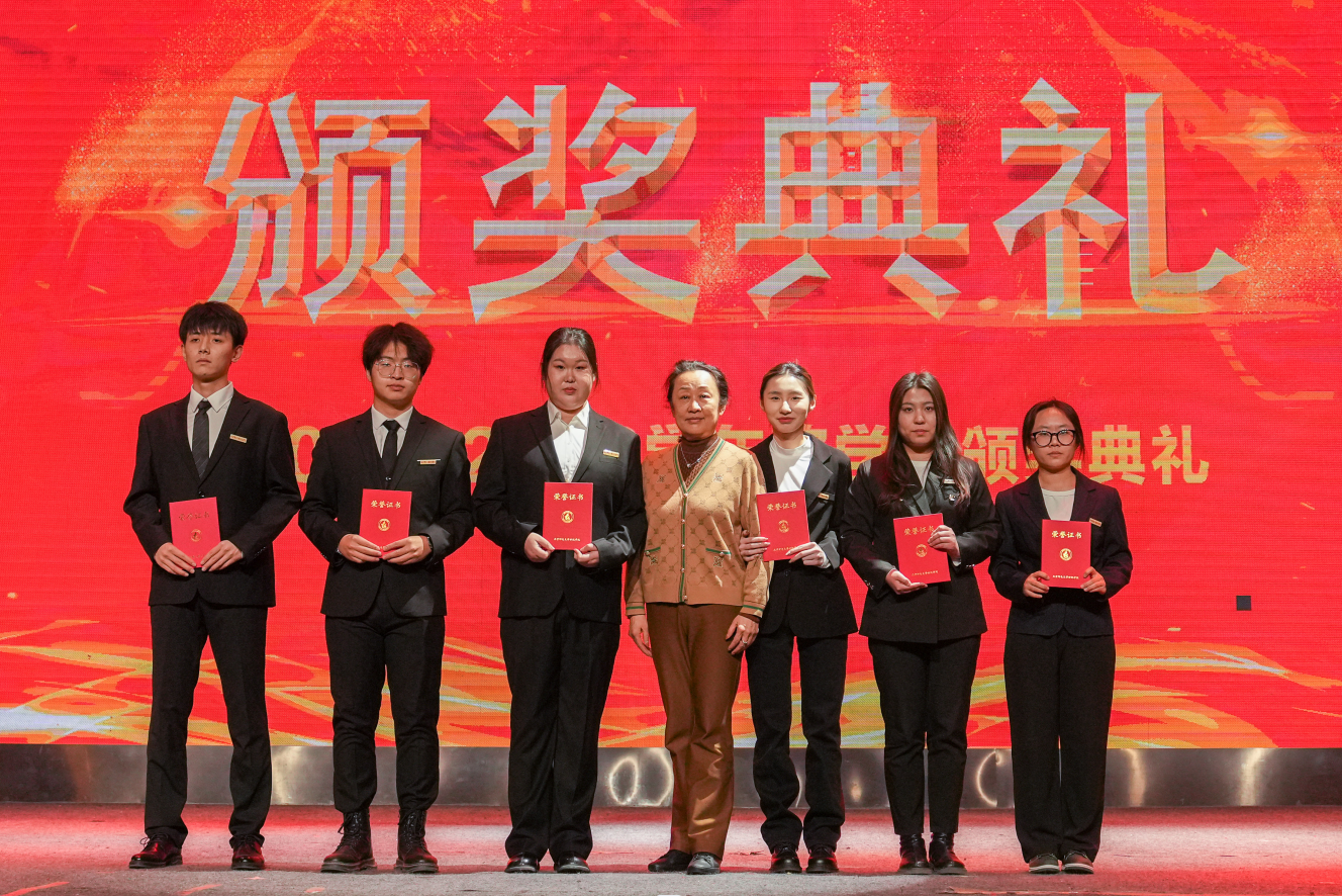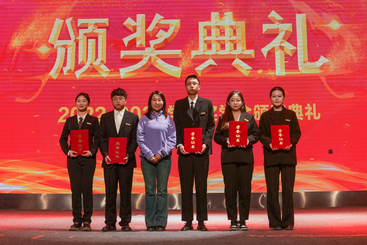 學院副院長何曉玫為獲得優秀學生干部的同學頒獎并合影留念
