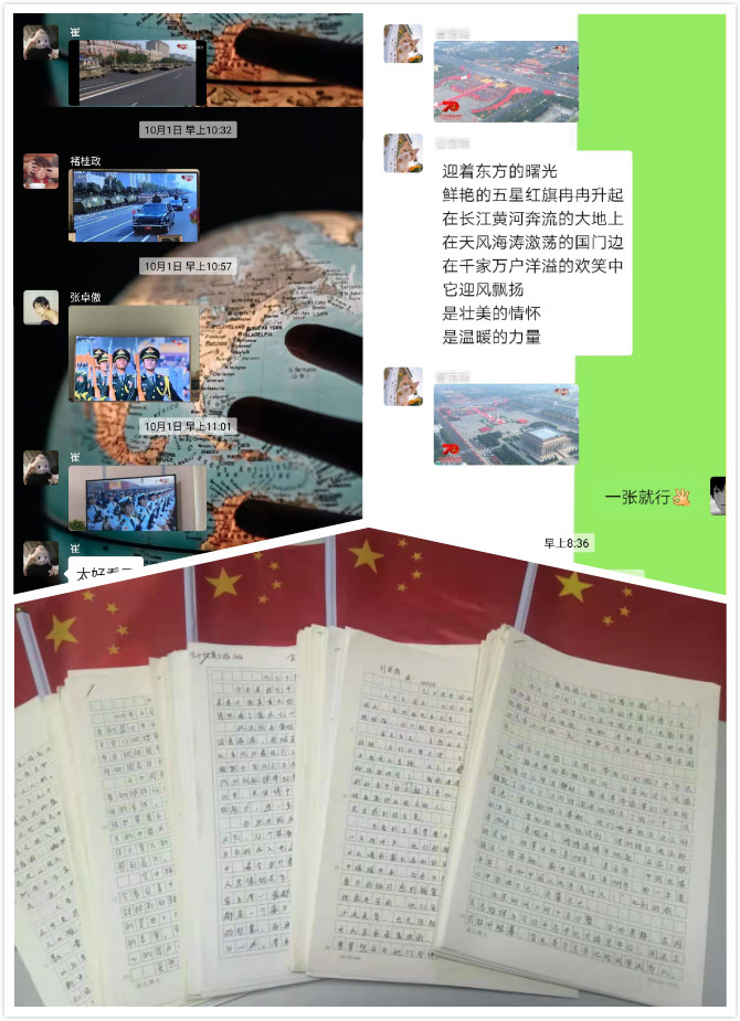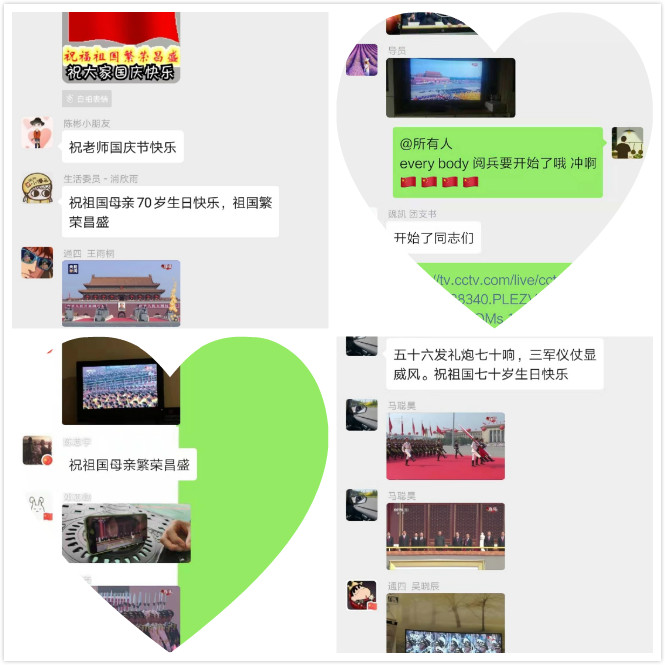 緊接著,11個空中梯隊振翅長空,雄鷹翱翔,呼嘯著依次低空從天安門飛過,向共和國獻上生日祝福,得到同學們的一陣驚呼,太帥了!在現場合唱團唱響《今天是你的生日,中國》,以“同心共筑中國夢”為主題的10萬群眾游行開始了,隨著現場游行隊伍各種主題的花車展示,一直到7萬羽和平鴿高飛,同學們的心情也是跌宕起伏,心潮澎湃,高潮迭起,慶祝大會結束后,大家的心情久久還不能平靜,同學們紛紛留言,“我愛你,中國!”“祖國,我愛你!”“祝愿祖國繁榮昌盛,明天會更好!”